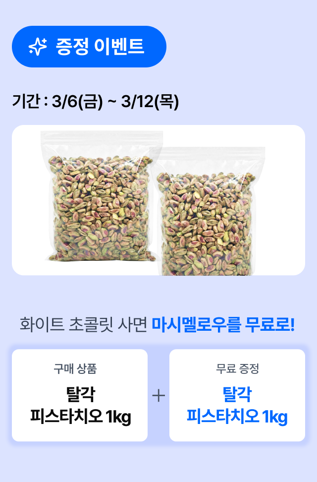 3/12(목)까지 피스타치오 1kg 주문 시 피스타치오 1kg가 추가 증정됩니다.